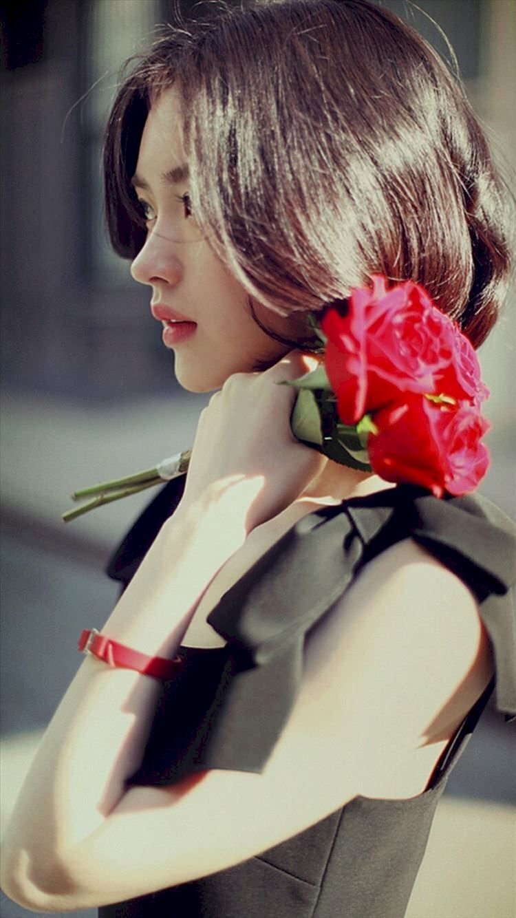 Ảnh con gái tóc ngắn xinh đẹp, dễ thương trên tay đang cầm bó hoa hồng