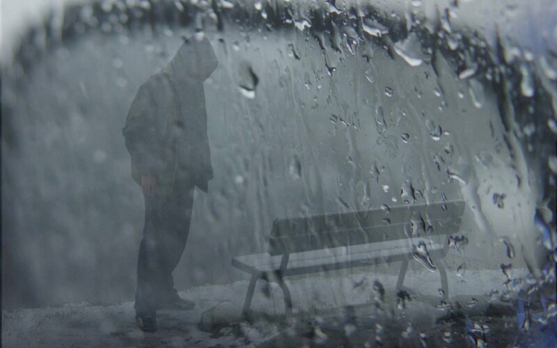 Ảnh đại diện buồn màu đen với hình ảnh một người đàn ông mặc áo đội mũ đen đang đứng cúi nhìn chiếc ghế đá qua góc nhìn một tấm kính dưới trời mưa