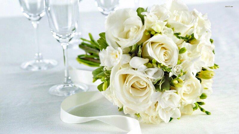 Ảnh hoa hồng trắng kết bó, nền trắng cách điệu 2 ly rựu mừng tiệc cưới