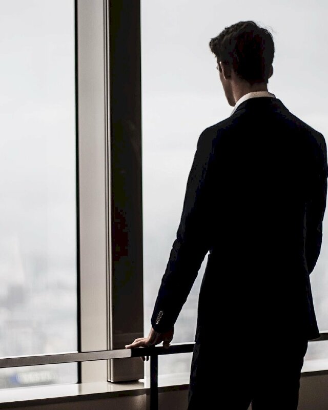 Ảnh nam nhân mặc vest che mặt đang quay lưng ra ngoài toát lên vẻ lạnh lùng, ngầu