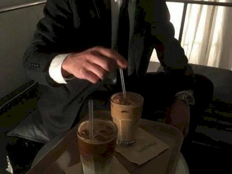 Ảnh nam nhân mặc vest che mặt bên ly cà phê