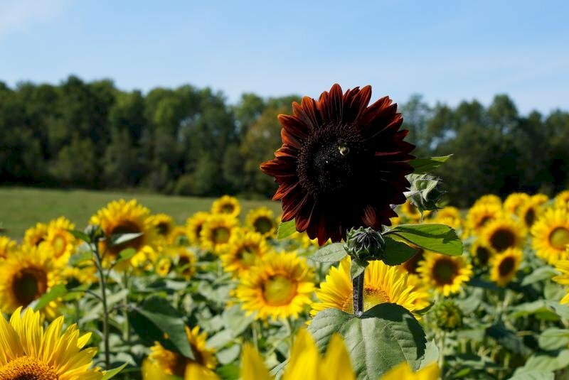 Hình ảnh hoa hướng dương đỏ giữa cánh đồng hoa hướng dương vàng