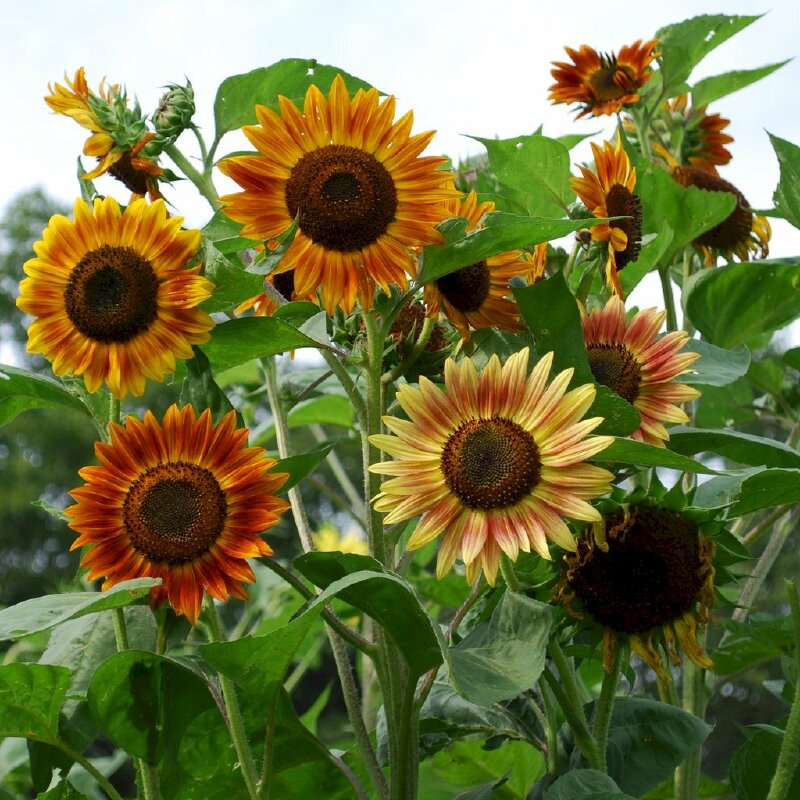 Hình ảnh hoa hướng dương đỏ cùng hoa hướng dương vàng trang trí trước hiên nhà