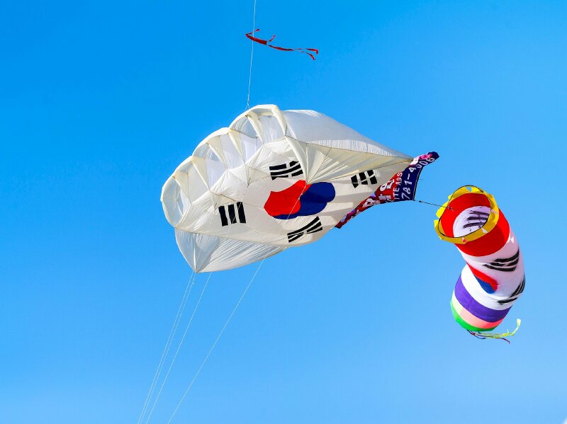 HÌnh ảnh lá cờ Hàn Quốc khi được thả bay lên giữa bầu trời trong một lễ hội