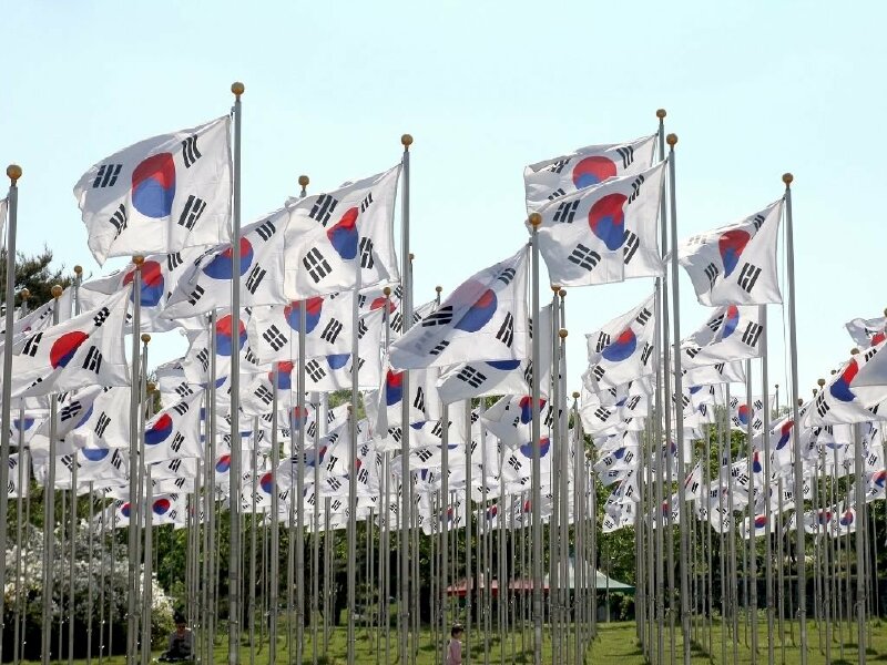 Hình ảnh nhiều lá cờ Hàn Quốc được cắm trên cột cờ đang tung bay