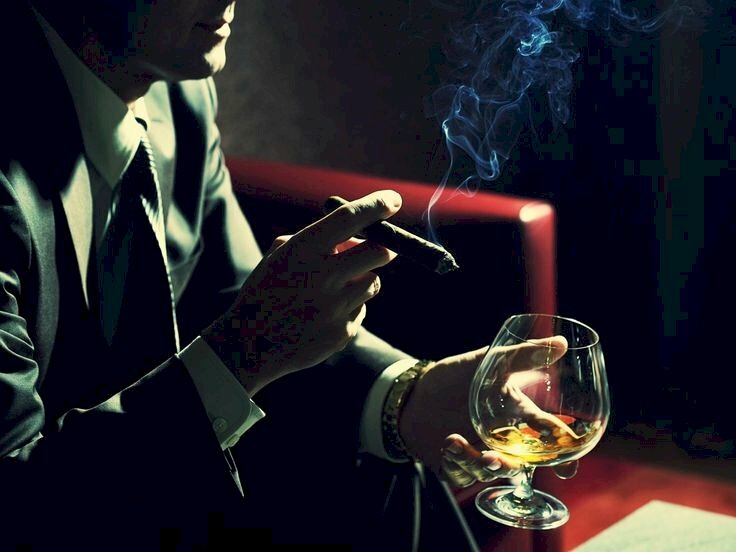 Hình ảnh doanh nhân cầm ly rượu vang với điếu xì gà đang cháy
