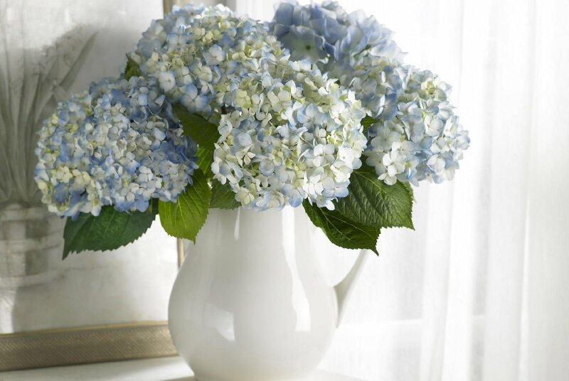 Hình nền bó hoa cẩm tú cầu được chưng trang trí trong bình bên cửa sổ