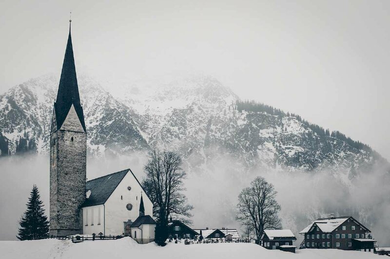 Một góc tại ngôi làng nhỏ với nhà thờ dưới trời mùa Đông tuyết trắng