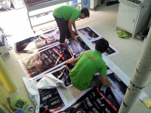 Nhân vien gia công In Kỹ Thuật Số đang thực hiện gia công banner hiflex số lượng lớn