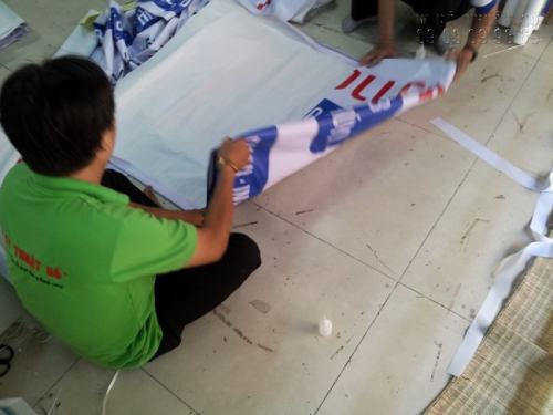 Nhân viên gia công đang thực hiện dán biên, cuốn mép cho băng rôn hiflex