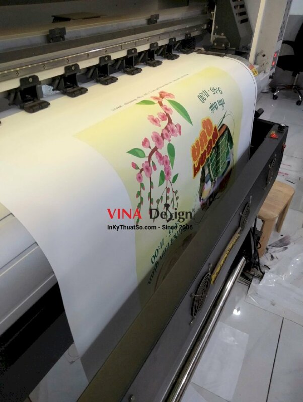 In poster khuyến mãi mừng Tết tại In Kỹ Thuật Số, thực hiện in trên máy Mimaki mực dầu, hình ảnh sắc nét, rực rỡ sắc xuân, hạt mực in đều, mịn