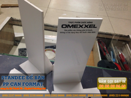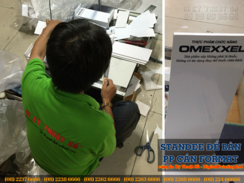 Sau khi in tấm PP với tên thương hiệu Thực phẩm chức năng Omexxel, nhân viên gia công của In Kỹ Thuật Số thực hiện dán bồi tầm PP lên tấm format đã được cắt thành hình, sau đó ghép lại với nhau thành standee mini để bàn kết hợp kệ trưng bày.