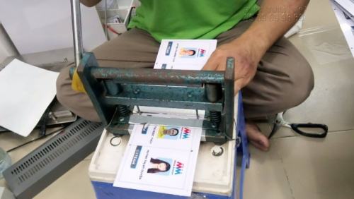 Nhân viên InKyThuatSo đang tiến hành gia công đục lỗ 4 góc cho thẻ nhân viên đặt in từ khách hàng