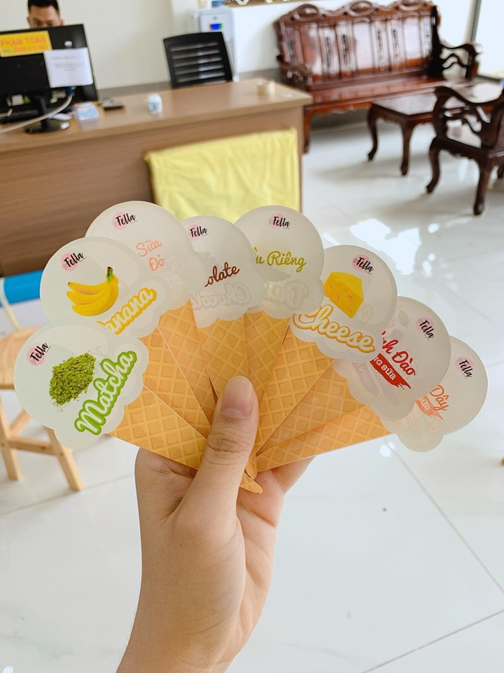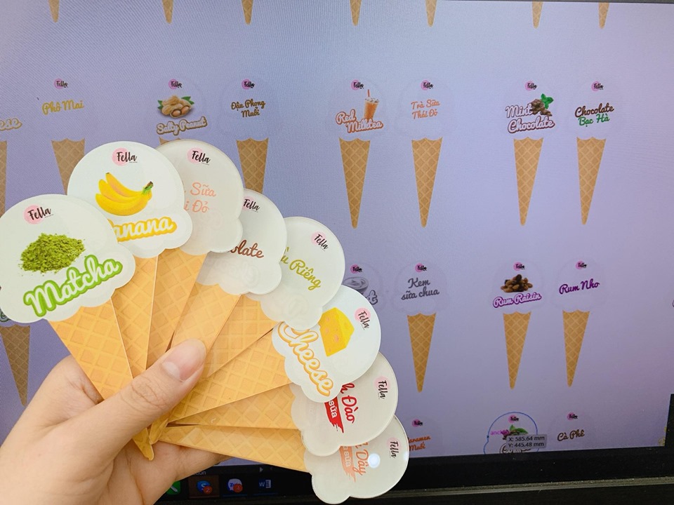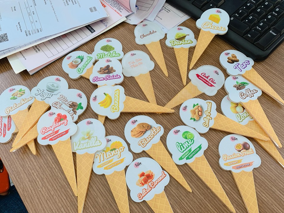 Phục vụ cho nhu cầu quảng cáo, cửa hàng Ice Cream đã đặt hàng In Kỹ Thuật Số Since 2006 loạt sticker mica siêu xinh ứng với từng vị của kem: matcha (trà xanh), banana (chuối), chocolate, cheese (phô mai), anh đào không sữa, pistachio (hạt dẻ cười), raspberry (mâm xôi - phúc bồn tử), Vanilla, mango (xoài), lime (chanh), biscotto (vị bánh quy), salted caramel, passion fruit (chanh dây), salty peanut (đậu phộng), coffee, longan (nhãn), tano, trà sữa thái đỏ,...