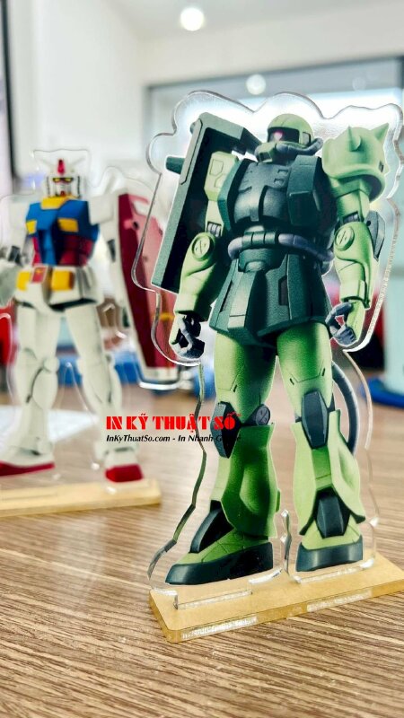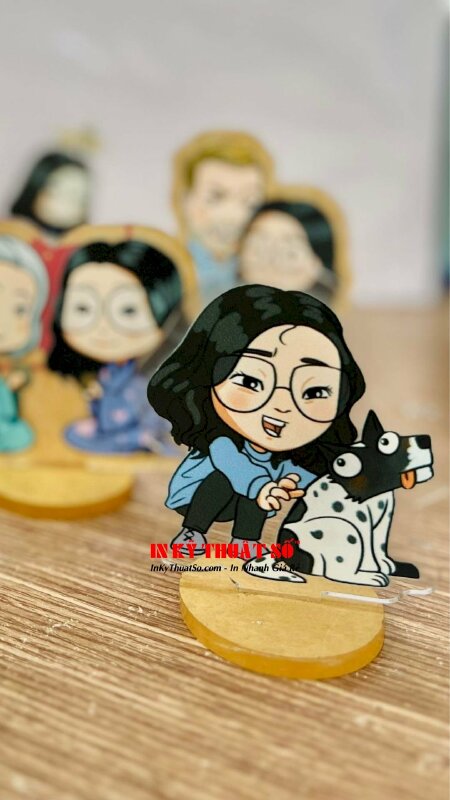 - Mica trong 3li: In UV ngược, lót trắng nền + gắn chân hình tròn