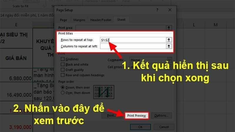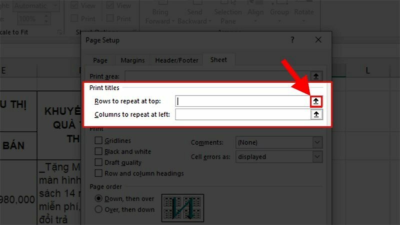 Bước 3: Tại Sheet của Page Setup, sẽ có hai tùy chọn bạn cần quan tâm: