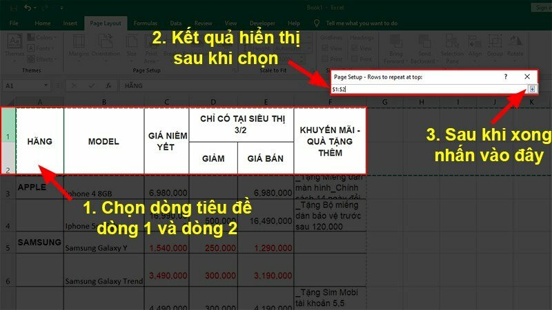 Chọn Rows to repeat at top để lặp lại tiêu đề ở hàng dòng, chọn vào ký hiệu như trên hình